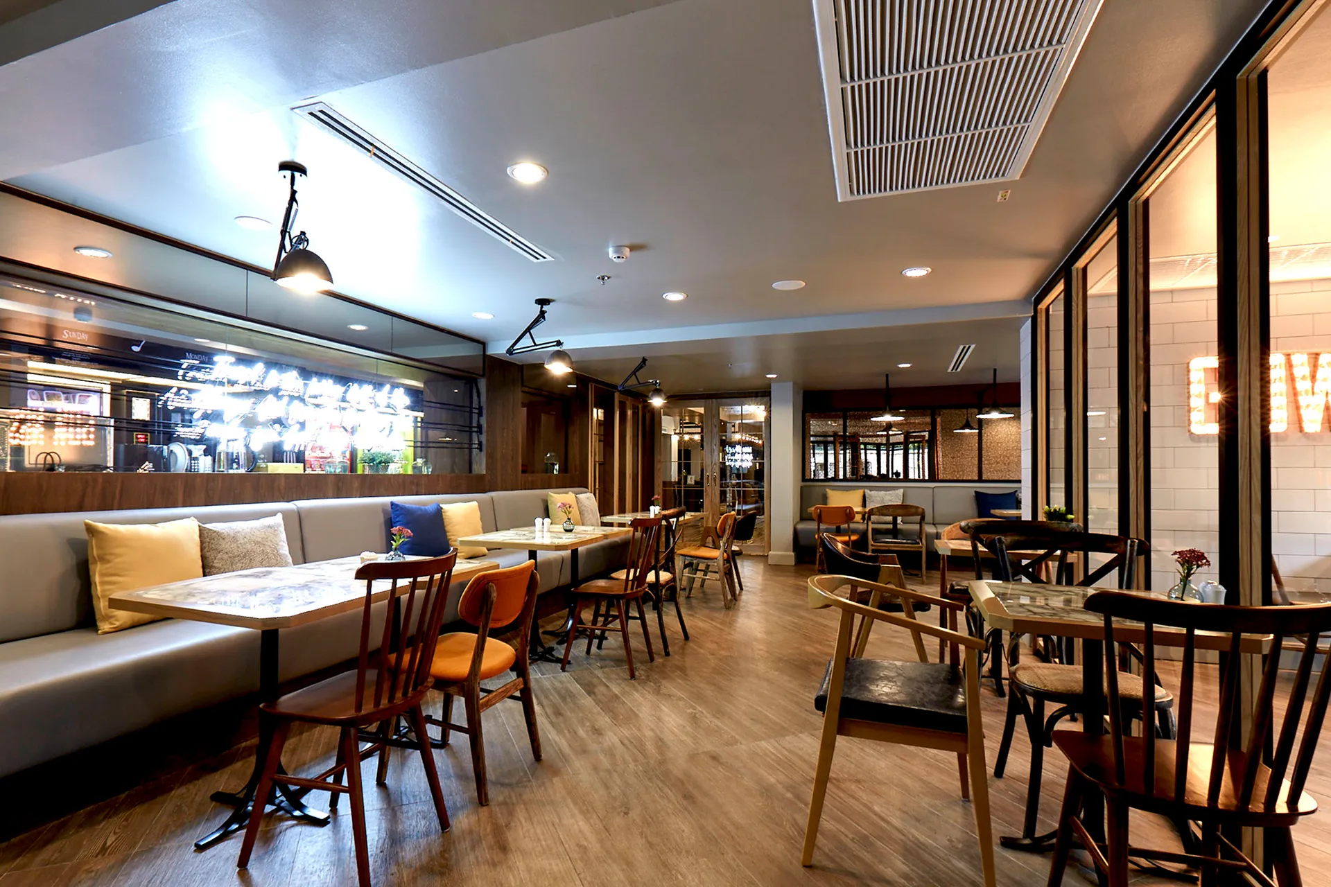 Established in July 2015, Gowings features a vintage chic style inspired by American Vintage Barber decor, with a mix of wooden chairs and unique marble-top tables. Offering 120 seats, it can be divided into 3 private rooms for meetings or small parties.